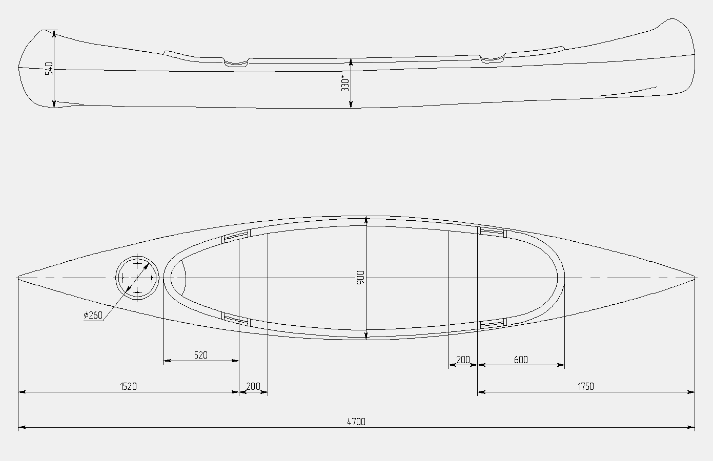 Корпус туристического каноэ изготовлен из стеклопластика, габаритные размеры: 470х90х38 см, вес – 21 max кг, пассажировместимость – 2 чел.