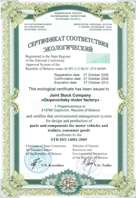 Environmental Protection Department has been certified in accordance with the requirements of STB ISO / IEC 17025, accreditation certificate № BY/112.02.1.0.05005. It has been certified for the providing of ecological rationing in accordance with the STB 1803-2007, certificate of conformity № BY/11204.19.074.10.