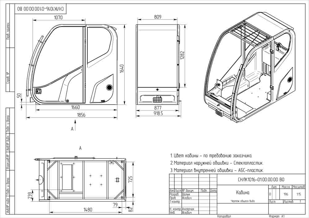 Кабина одноместная, закрытая, представляет собой сборный коррозионно-стойкий корпус каркасного типа.