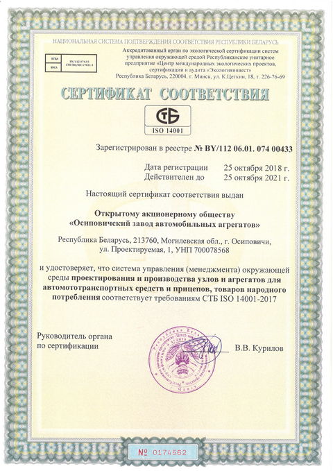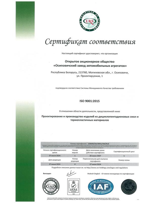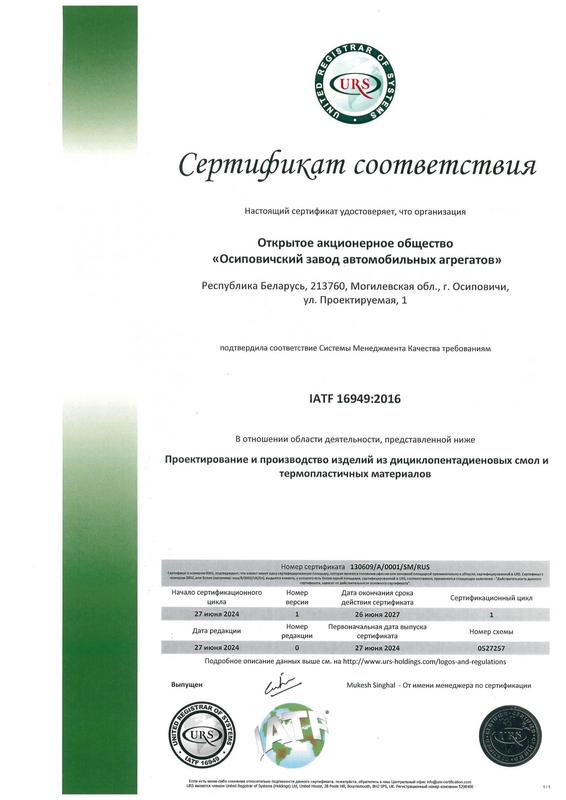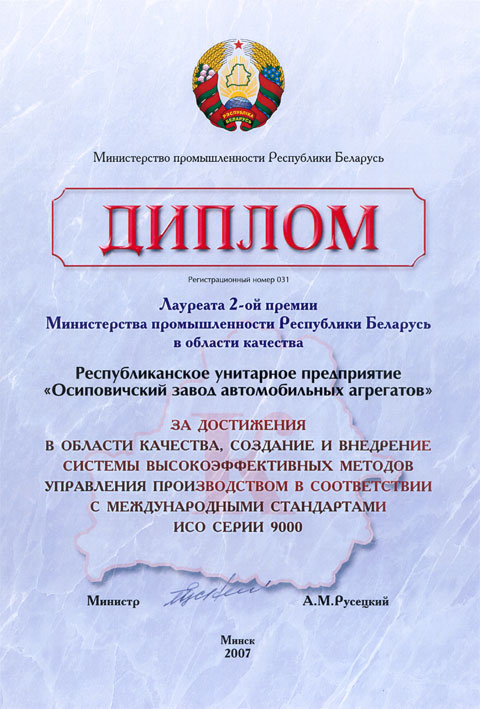 На предприятии внедрена и сертифицирована система менеджмента качества проектирования и производства узлов и комплектующих для автомототранспортных средств и прицепов, потребительских товаров на соответствие требованиям СТБ ISO 9001.