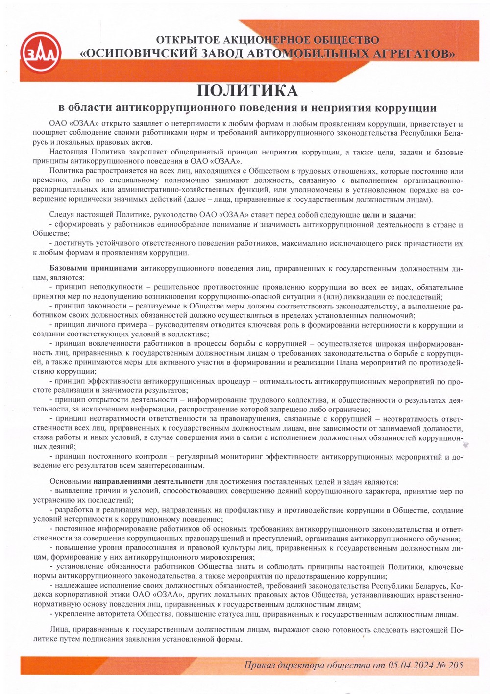 План мероприятий по противодействию коррупции в ОАО «ОЗАА» на 2023-2025 годы.
